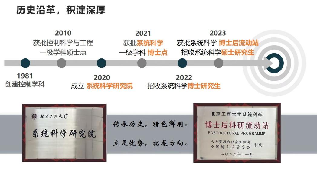 The Systems Science discipline at Beijing Technology and Business University (BTBU) has its roots in the Control Science and Engineering discipline at the former Beijing Institute of Light Industry, established by distinguished experts in control science, Professor Xia Deqian and Professor Lei Yuanchao. Over four decades of continuous growth and development, BTBU founded the Institute of Systems Science in 2020. In 2021, it was approved to establish a doctoral program in the primary discipline of "Systems Science," followed by the approval of a postdoctoral research station in 2023. This marks the formation of a complete, research-oriented talent development system spanning undergraduate to doctoral and postdoctoral levels.
