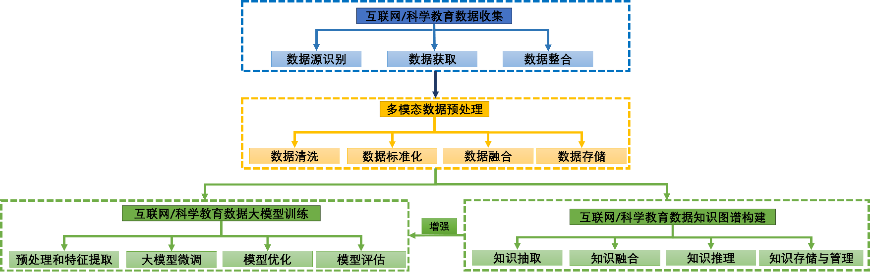 1.多模态互联网/科学教育数据大模型构建:我们通过增量采集和整合企业内部数据、市场调研数据和公开数据资源,并进行数据清洗和标注,构建能处理和分析大规模多模态数据(文本、图像、音频)的垂类大模型。此外,团队还专注于开发领域知识图谱,以提升LLM对数据的语义理解能力,支持复杂的分析和决策任务。