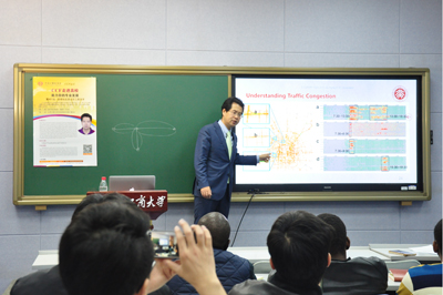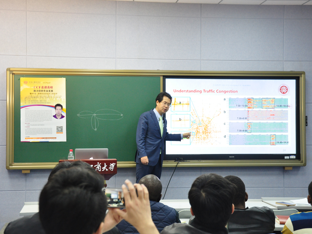 在讲座中,袁晓如教授介绍了在现代社会大数据处理和分析的困难性,以及可视化方法对公众和决策者的重要性。袁教授系统的介绍了其团队在城市交通数据可视化方面的多个案例,其使用的数据集包括出租车GPS、RFID记录、IC卡、手机信号和社交媒体数据。通过合理的可视化手段,专家可以进行交互式的数据探索工作。通过袁晓如教授图文并茂、耐心细致的讲解,多种城市交通可视化方法的思路、布局、方法、结论一一展现在听者面前。随后袁教授还讲解了大数据分析在当前社会环境下的重要意义。