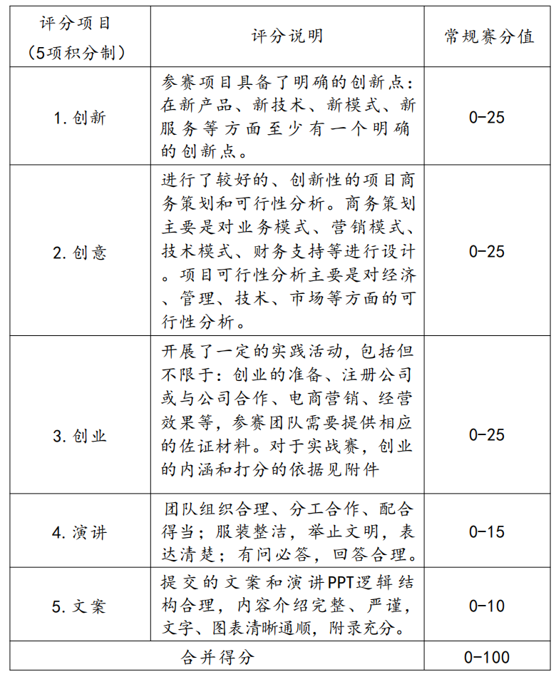 注意:对于总分一样的多个团队,则根据评分表中各项的优先顺序确定,从而保证最终的排名无并列情况。如,AB两个团队总分均为80分,排名并列第1。其中A团队的创新分为22分,B团队的创新分为20分,则A团队的排名高于B团队。此时,如果只有一个晋级指标,则A团队可获得晋级,B团队无法获得晋级。