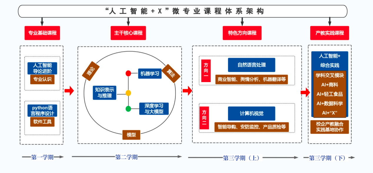 学习安排详见附件1“人工智能+X”微专业教学计划表。课程体系架构如下图所示: