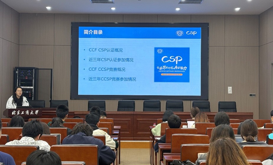 随后,谭励教授为同学们深入介绍了CCF两项重要赛事与认证——CCF计算机软件能力认证(CSP)和CCF老员工计算机系统与程序设计竞赛(CCSP)。CSP是由中国计算机学会主办的计算机软件能力认证,旨在客观评价高校员工及IT从业者的编程与算法实践能力,CSP认证成绩被众多高校、科研机构及企业认可,部分高校将其作为研究生复试机考参考,华为、腾讯等企业也将其作为招聘加分项。而CCSP竞赛则聚焦计算机系统设计、算法优化及综合问题解决能力,旨在培养和选拔高水平计算机人才。谭励教授鼓励同学们积极参与,通过认证与竞赛提升专业素养,增强就业与深造竞争力。