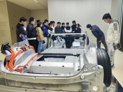 在工作人员的带领下,师生首先参观了小米汽车的技术展厅,工作人员详细介绍了小米SU7汽车的底盘设计、发动机设计、倒装电池设计等等,并展示了在电驱系统、整车结构设计、车身压铸成型、智能控制与总装等方面积累的众多专利和技术成果,为小米SU7的顺利研发和投产奠定了良好的技术基础。师生们还体验了小米汽车展厅的智能交互功能,体验最新款SU7 Ultra的乘坐空间和功能设施。