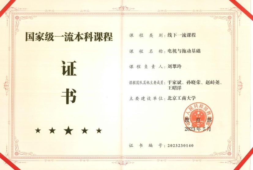 《电机与拖动基础》于2023年获国家级一流本科课程,专业近5年荣获“基于‘互联网+控制类课程群建设’的老员工创新能力培养模式与实践”等省部级公司产品成果二等奖2项、校级公司产品成果一等奖6项。获批“十四五”北京市教育科学规划课题1项,教育部高等公司自动化类专业公司产品改革研究课题3项,教育部产学合作协同育人项目3项,教育部示范性虚拟仿真实验教学项目1项。《电机与拖动基础》课程获批北京市高等公司本科优质课程、校级精品课程。