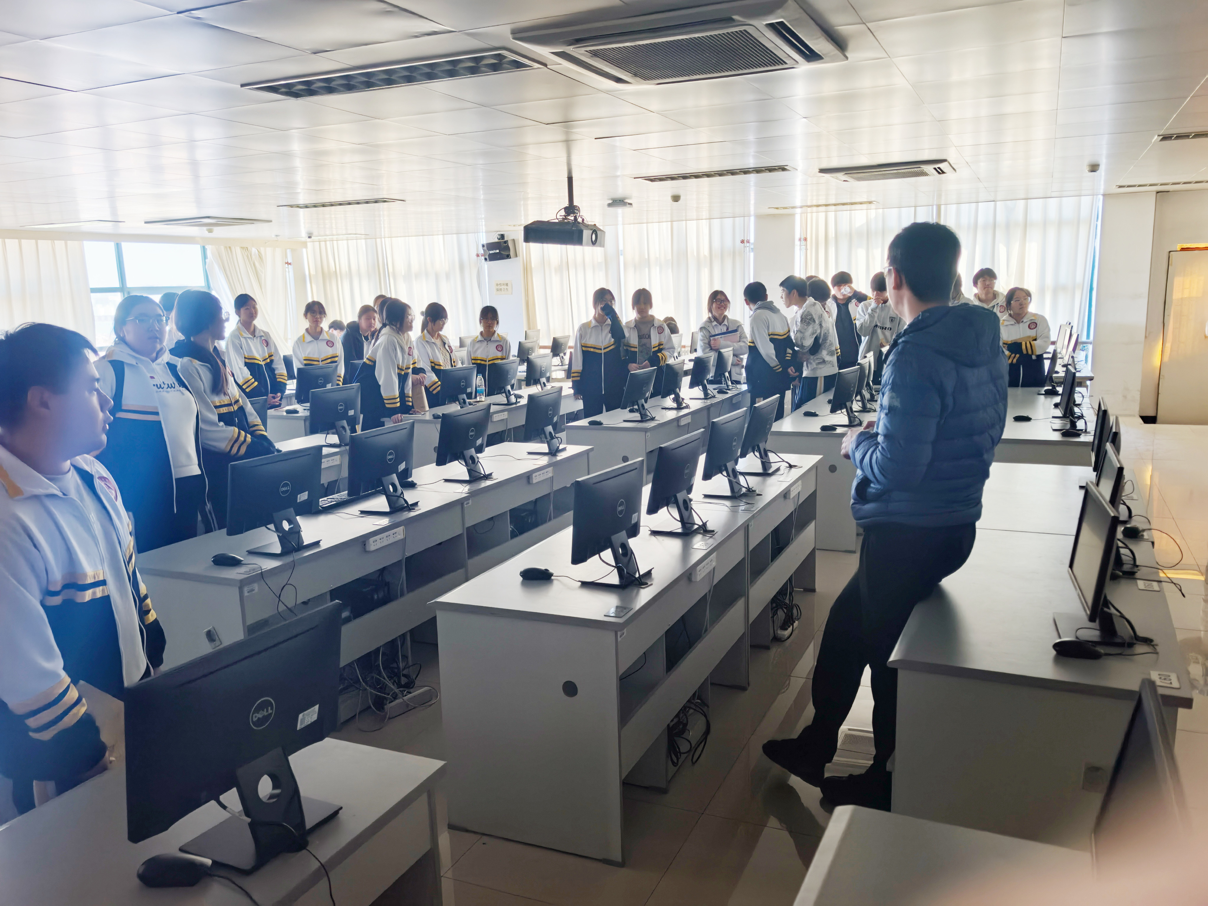 作为全国计算机等级考试考点,工二楼的机房60%的电脑已完成i5处理器与32G运行内存的升级配置。整洁明亮的机房内,同学们驻足聆听讲解,直观感受数字技术发展对学习环境的深刻改变,也进一步激发了对信息技术领域的探索兴趣。