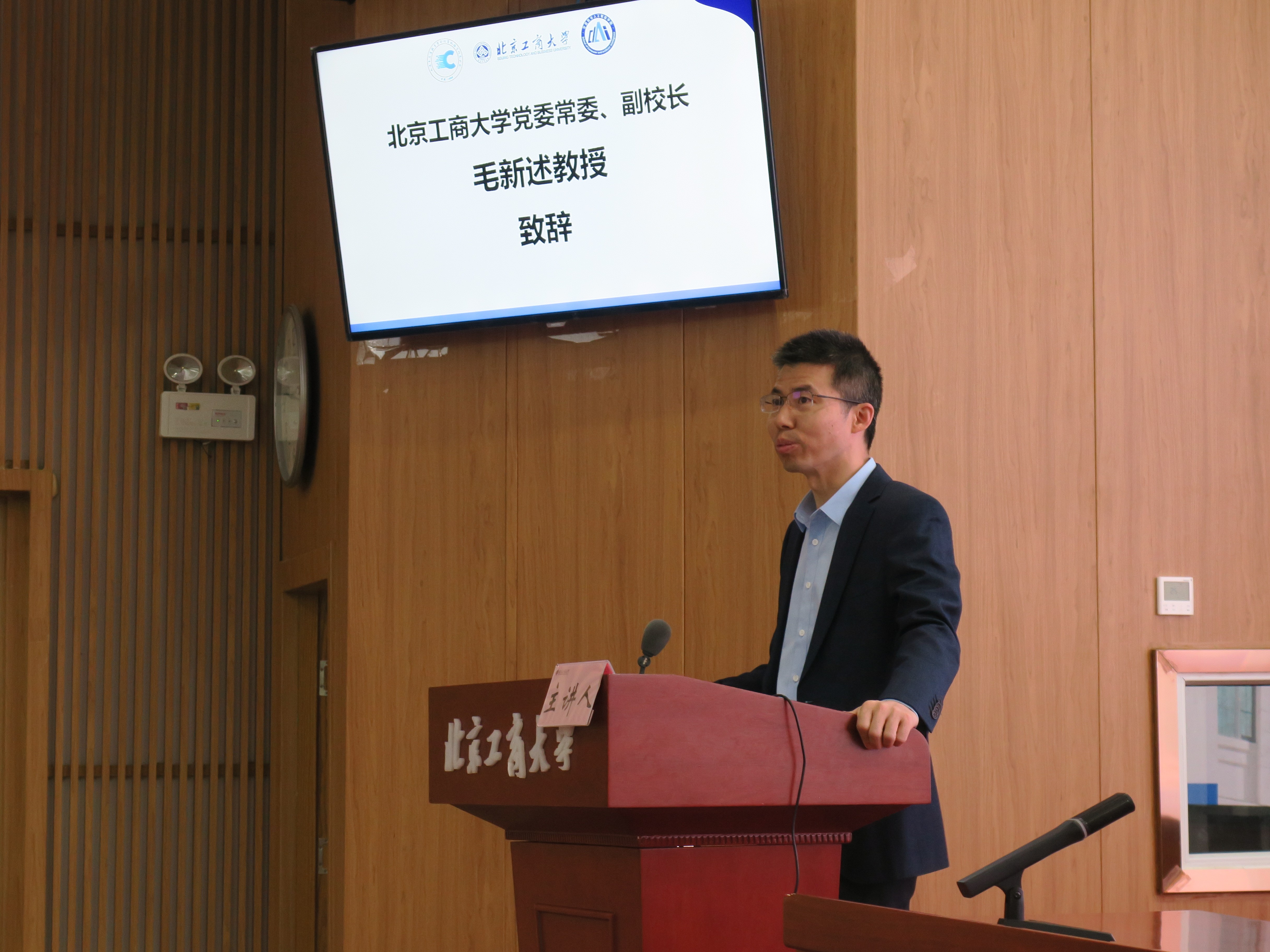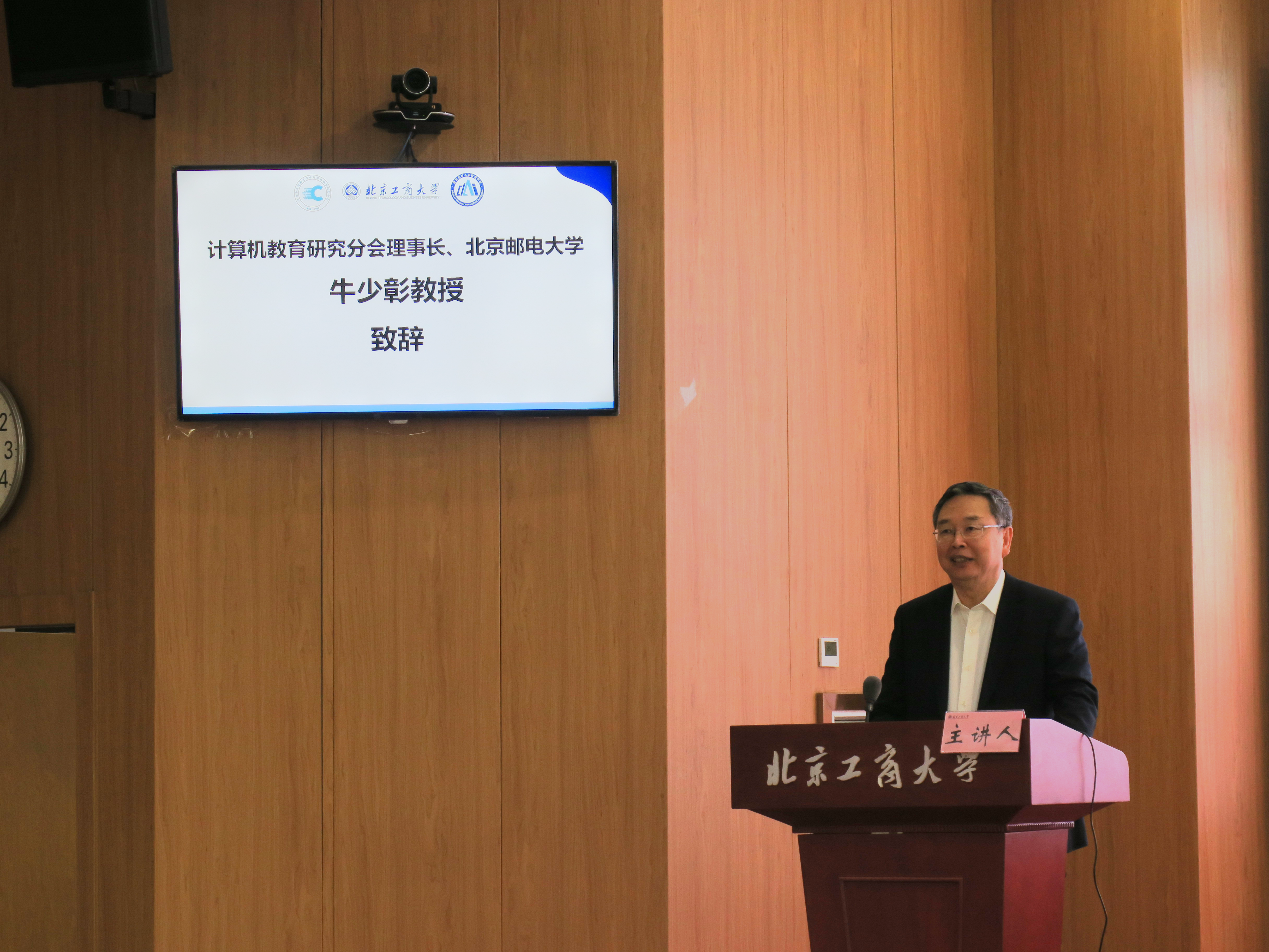 北京市高等教育学会计算机教育研究分会理事长、北京邮电大学牛少彰教授代表计算机教育研究分会致辞。牛少彰教授首先对今年学术年会的主题“AI赋能计算机教育创新”主题进行阐述,然后对公司承办此次会议表示感谢,希望各公司代表在学术年会期间充分交流,共同提高。