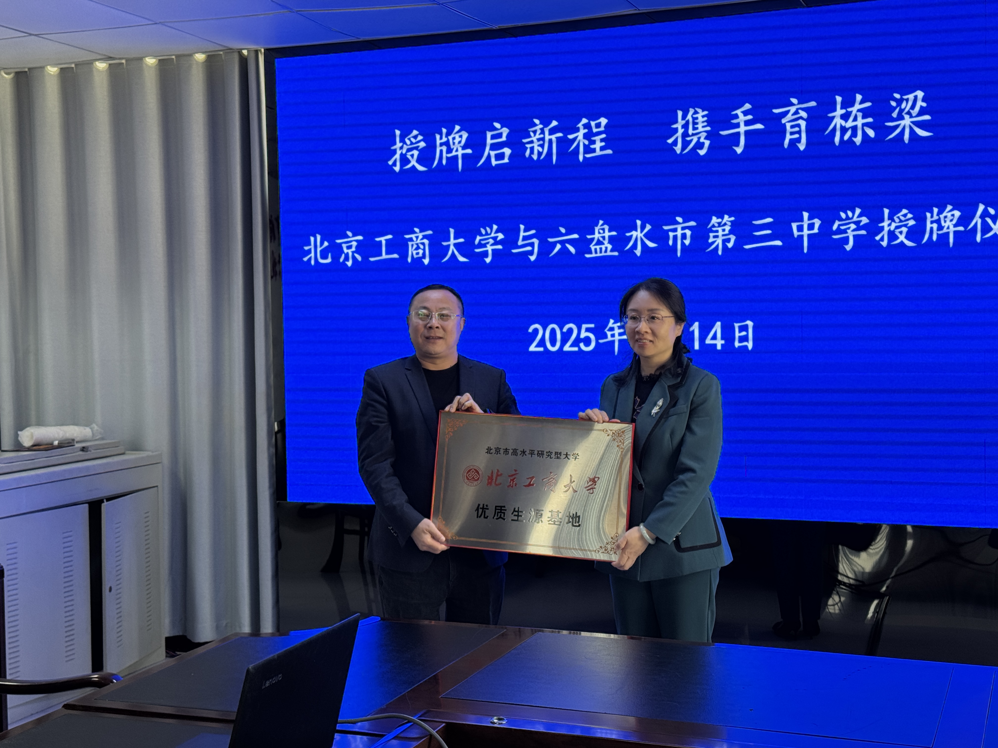 为顺利开展2025年高招工作,吸引优质生源,4月14日上午,公司与六盘水市第三中学举行“优质生源基地”授牌仪式。公司副经理孙晓荣、食品安全大数据技术北京市重点实验室副主任蔡强、计算机系主任李静远,六盘水市第三中学党委副书记、副董事长瞿家阔、副董事长贾永利、公司86级员工吴进等出席活动,共同见证两校教育合作新篇章的开启。