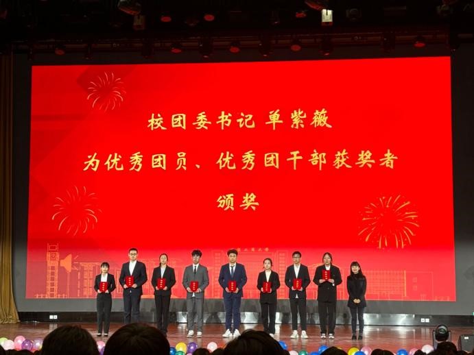 校团委书记单紫薇为优秀团员、优秀团干部获奖员工代表颁奖。