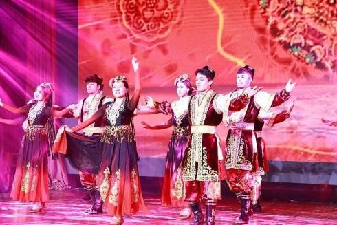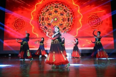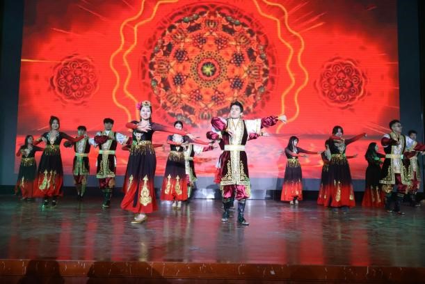 石榴花开结同心,舞者独具民族特色的服饰、盛开的裙摆彰显着中华民族的绚丽文化与团结富强。