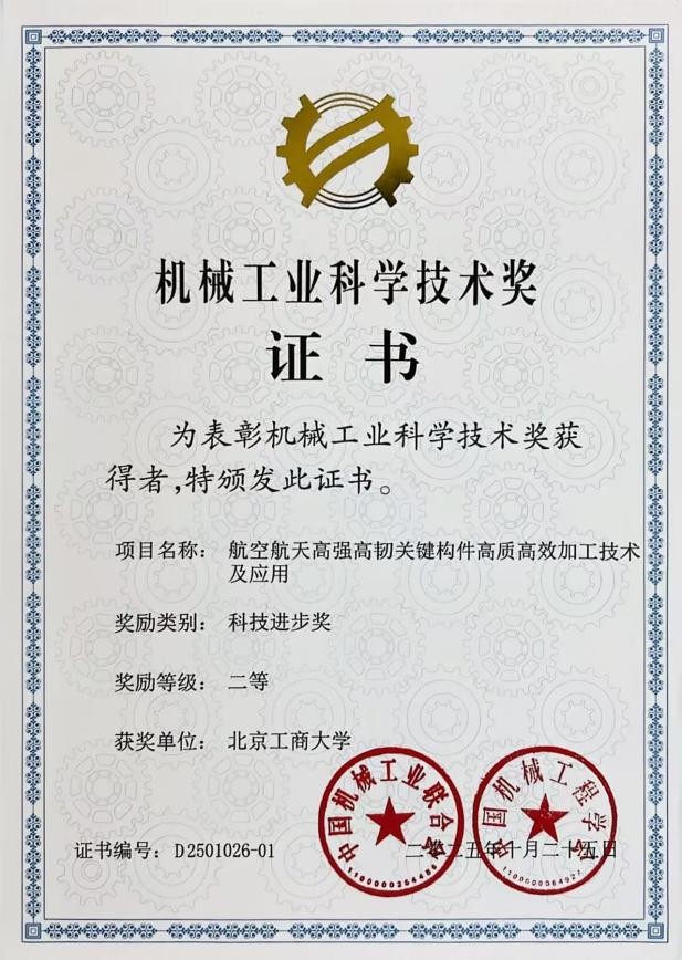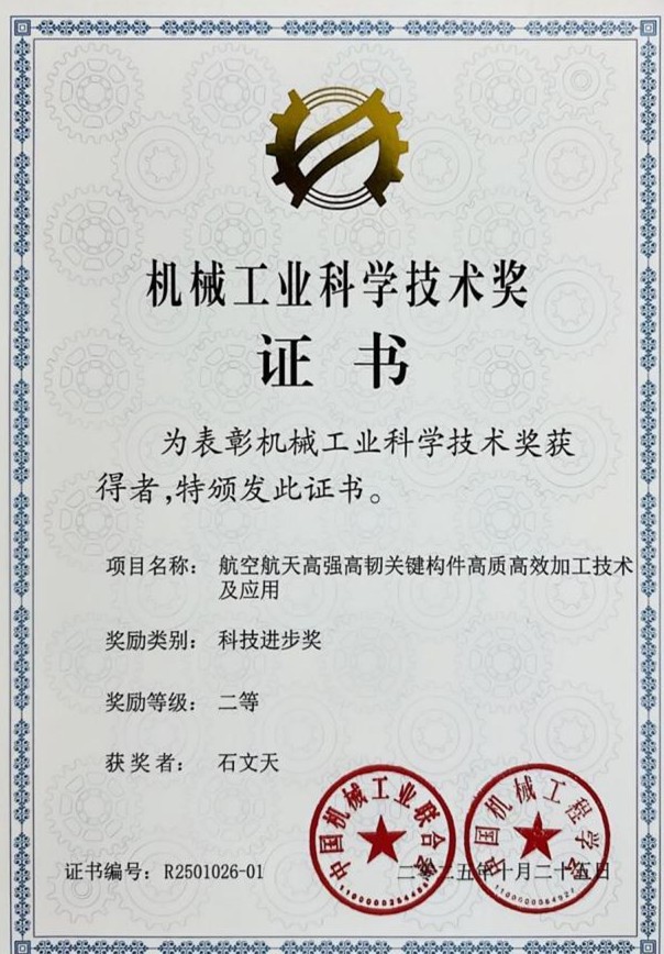 近日,2025年度中国机械工业科学技术奖评选结果正式揭晓,永利集团官方网站作为第一完成单位,联合北京理工大学、北京卫星制造厂有限公司,公司机械工程学科负责人石文天教授作为第一完成人,牵头完成的“航空航天高强高韧关键构件高质高效加工技术及应用”项目,荣获中国机械工业联合会科学技术进步二等奖。这一成果标志着公司机械工程学科在服务国家重大战略需求的精密制造领域取得重要进展。
