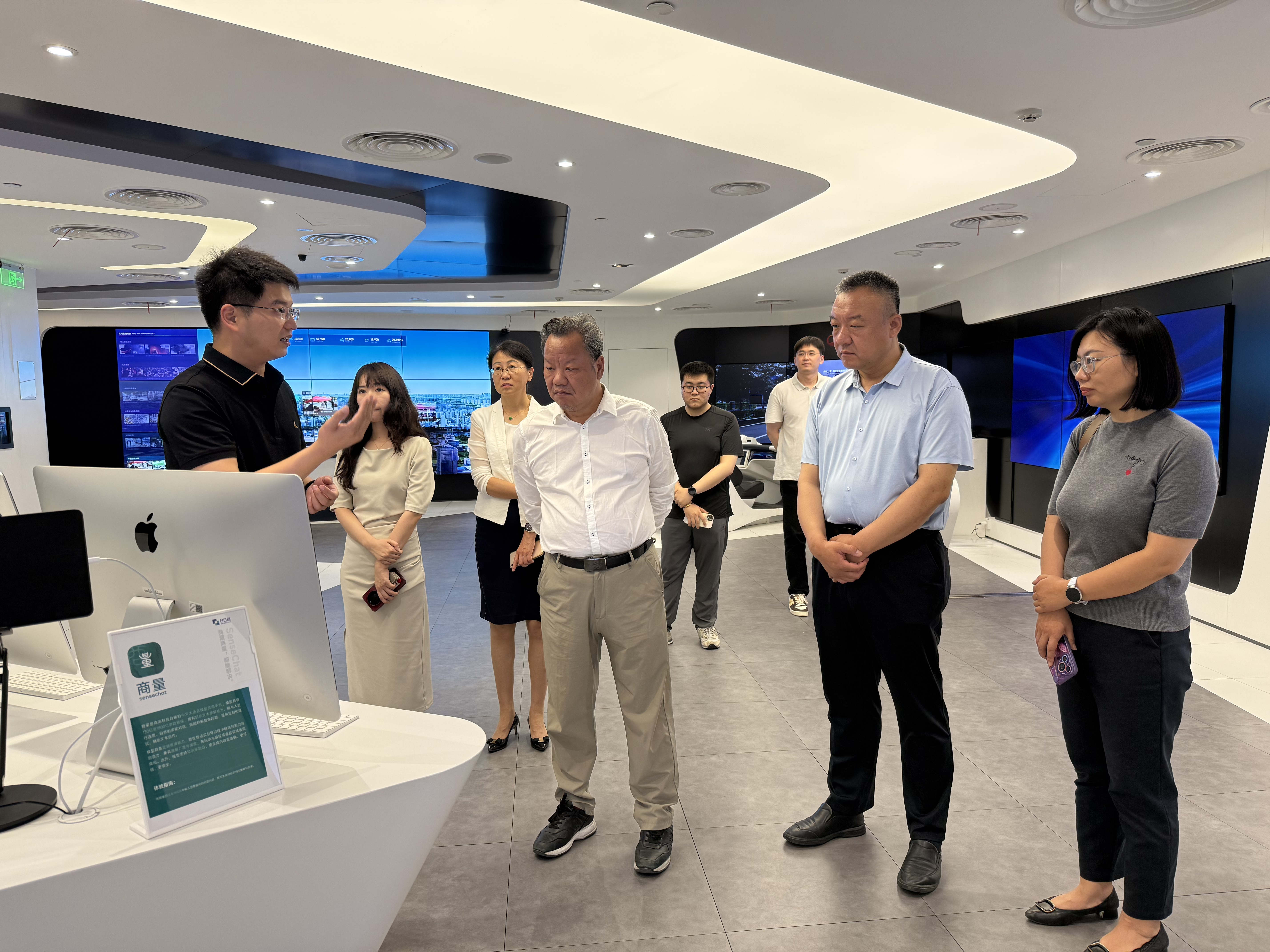 郑文红一行在朱宁引导下参观了公司人工智能应用展区,详细了解了商汤科技在感知智能、智算中心、自然语言处理、决策智能、多模态大模型等关键技术的研究成果,以及智慧城市、智慧汽车、智能汽车、智慧生活、智慧教育等领域的落地案例。
