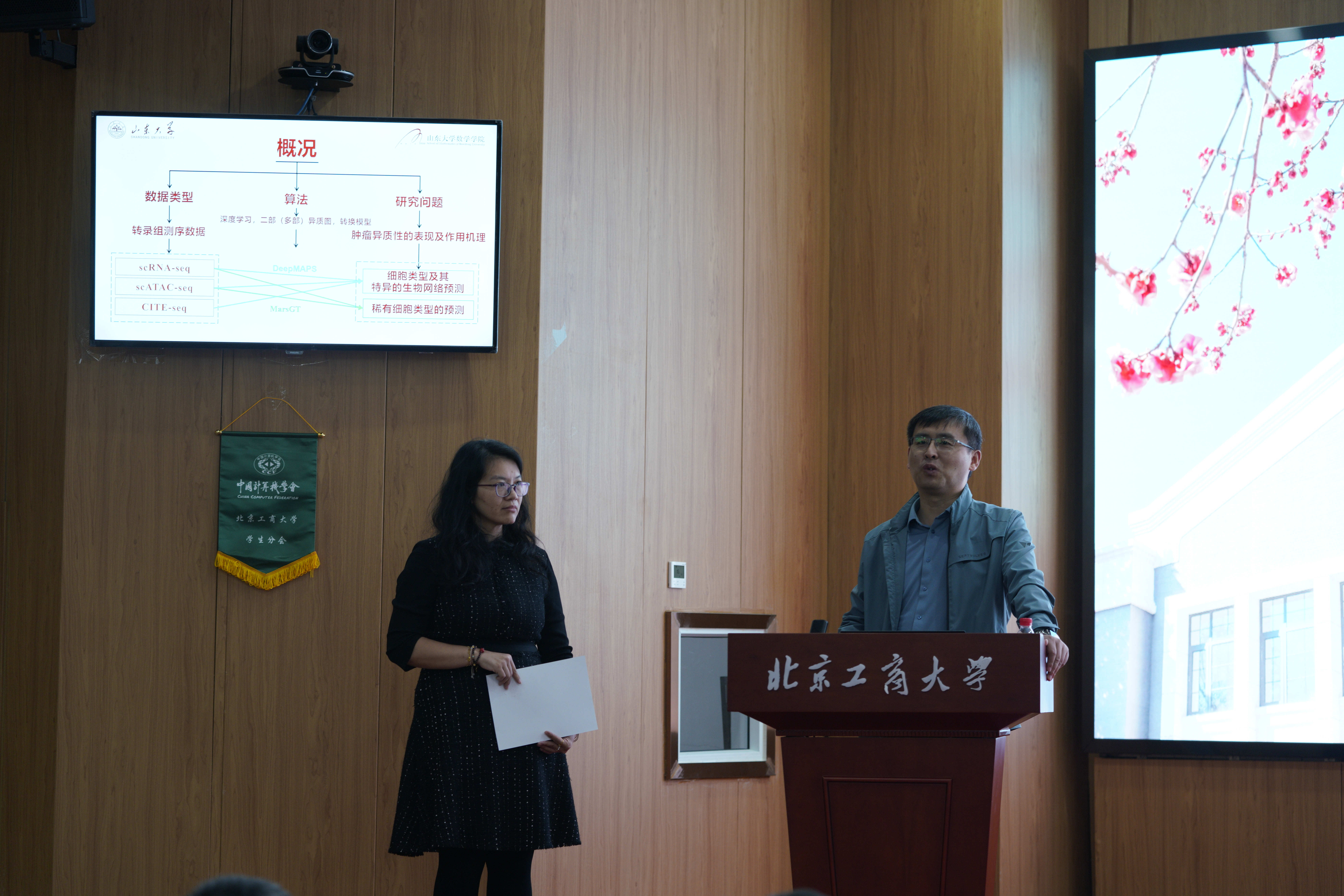 山东大学刘丙强教授作了题目为“基于多组学数据的细胞特异性及其调控网络研究”的特邀报告。报告中,刘教授深度解析了细胞异质性和肿瘤细胞的复杂性,提到尽管细胞具有相同的DNA,但其表现差异显著,背后的机制在于基因调控网络的不同表达方式。接着,刘教授详细介绍了DeepMAPS和MarsGT两项工作,DeepMAPS可以预测单细胞生物网络的异质图转换模型,能够整合scRNA-seq与scATAC-seq数据,构建SFP模型以生成细胞特征下的调控网络,从而实现对细胞调控网络的精准预测。MarsGT用于预测稀有细胞类型的多部异质图转换,通过构建异质图来捕获多组学数据中的细胞异质性。最后,刘丙强教授指出,细胞生物网络没有准确的答案,只能从侧面去验证结果的准确性,通过深度学习技术的应用,研究人员能够从大量的生物医学数据中提取有价值的信息,为精准医疗和个性化治疗提供了可能。