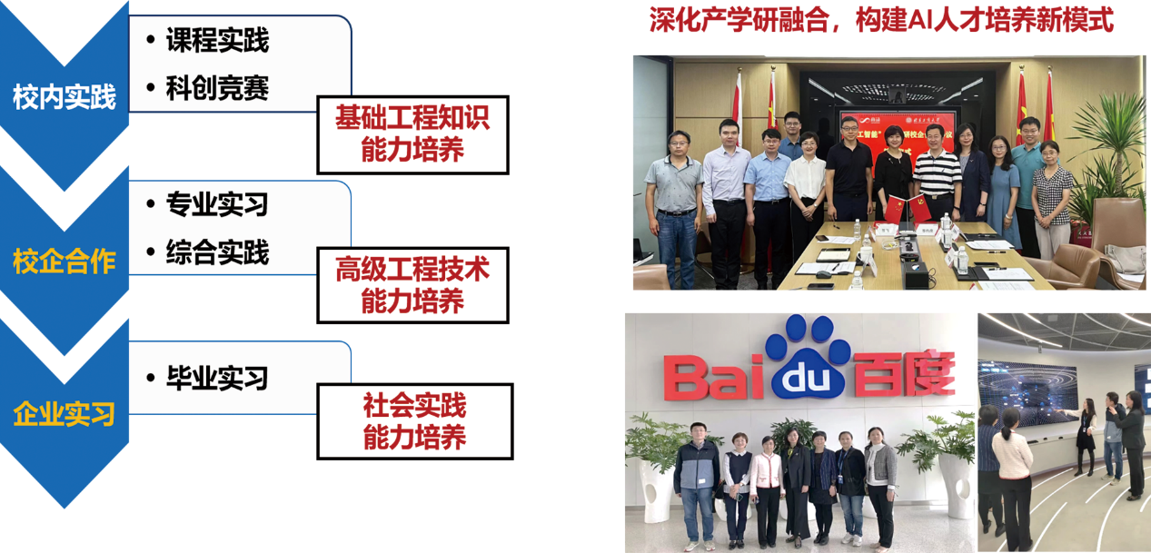 本专业致力打造与AI企业深度融合的全链条层次化实践教学体系,贯穿专业认识实习、课程实践、综合实践、毕业实习等实践培养环节,系统科学培养员工基础工程知识能力、高级工程技术能力及社会实践能力,深化人工智能专业人才培养新模式。目前本专业已与百度、商汤、智谱华章、思必驰等多家知名 AI 企业签署校企合作框架协议,为人才培养和就业提供良好的生态环境。同时本专业依托校内多个国家级及省部级实践教学和科研平台,坚持“以赛促学,以赛促教”,提升员工创新实践能力。