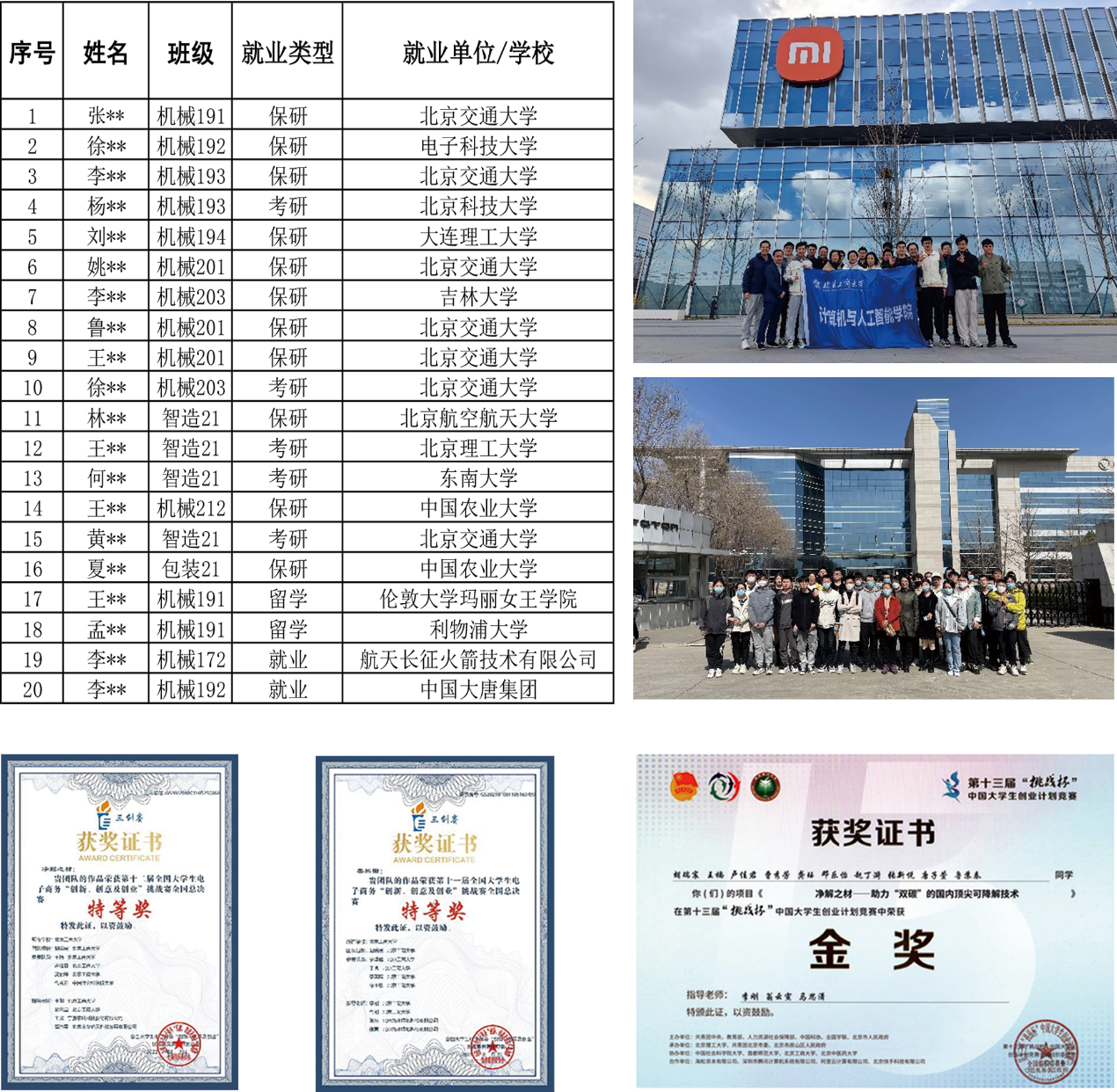 本专业近年来有多名员工考取或保送清华大学、北京航空航天大学、北京理工大学、中山大学、大连理工大学、北京科技大学等国内知名大学,以及伦敦大学玛丽女王公司、利物浦大学等国外知名大学。