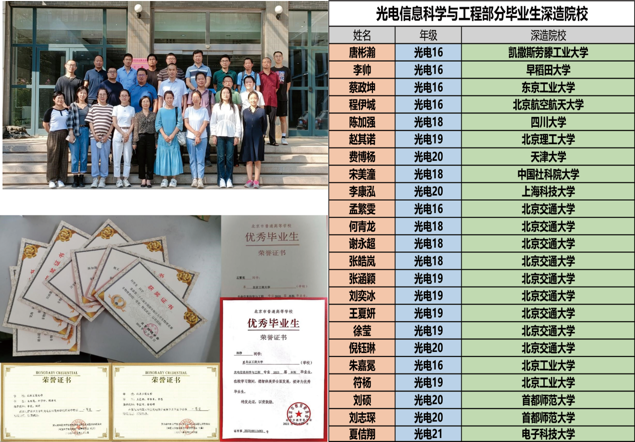 本专业既有宽的就业出口,也可进一步深造,毕业生可在光学工程、光学、物理电子学、材料科学与工程等方向继续攻读硕士、博士学位。前三届毕业生考研及出国深造率平均为64.2%,毕业深造的国内高校有北京航空航天大学、天津大学、北京理工大学、四川大学、北京交通大学等,国外高校有德国凯撒斯劳滕工业大学、日本早稻田大学、东京工业大学等,深造专业都属于光电相关学科。就业单位有京东方科技集团、清华紫光、通威太阳能、凯普林光电、杏林睿光等。